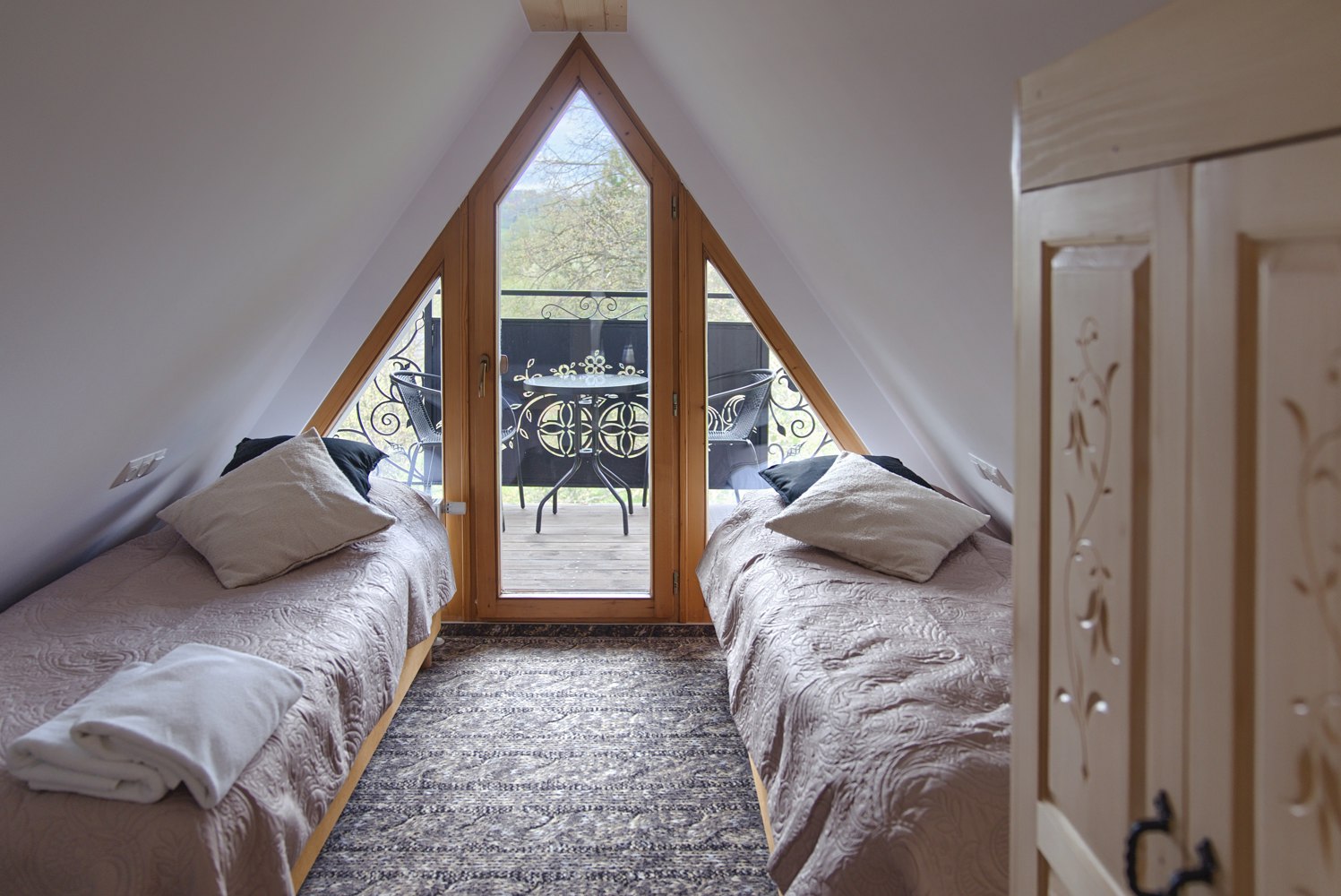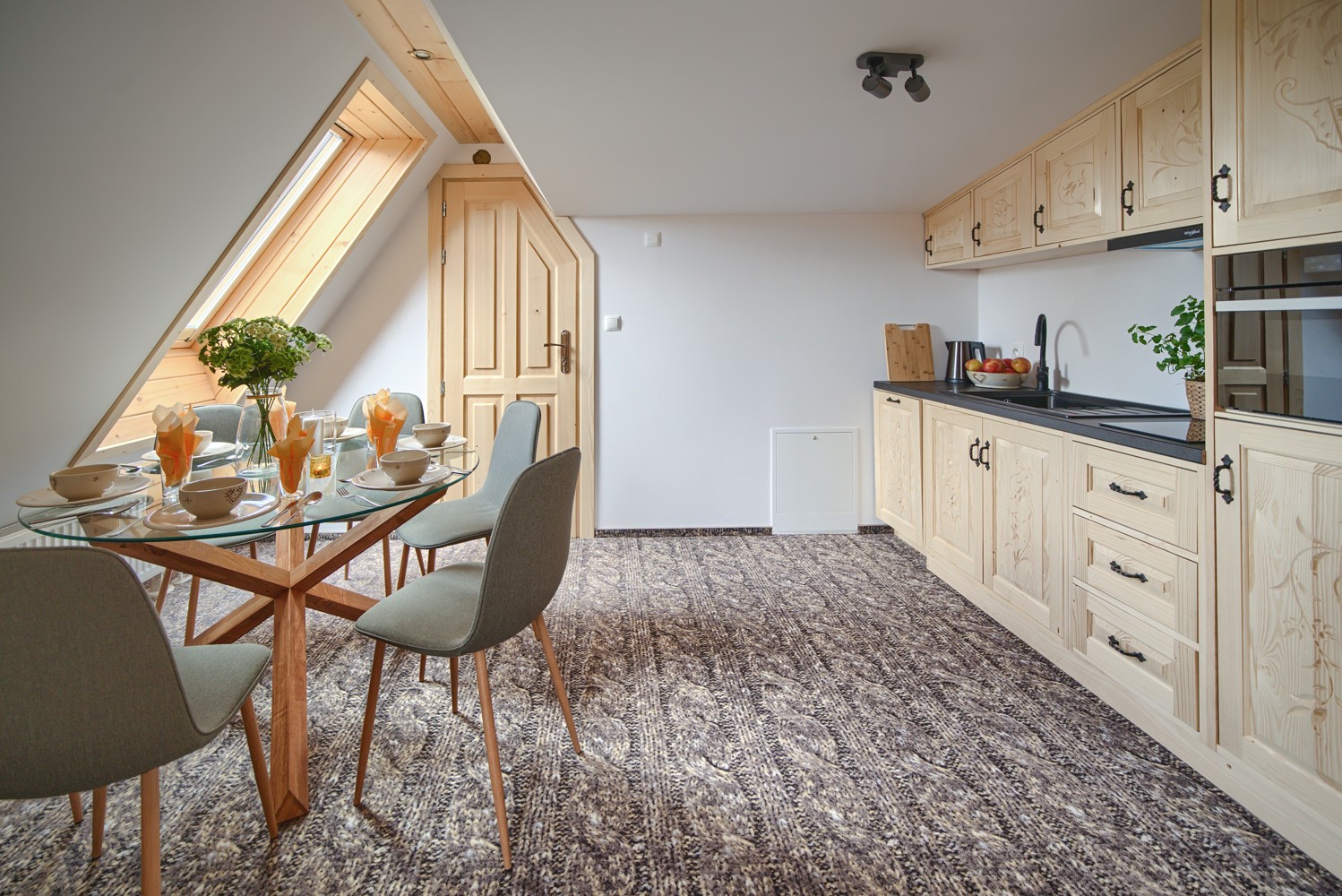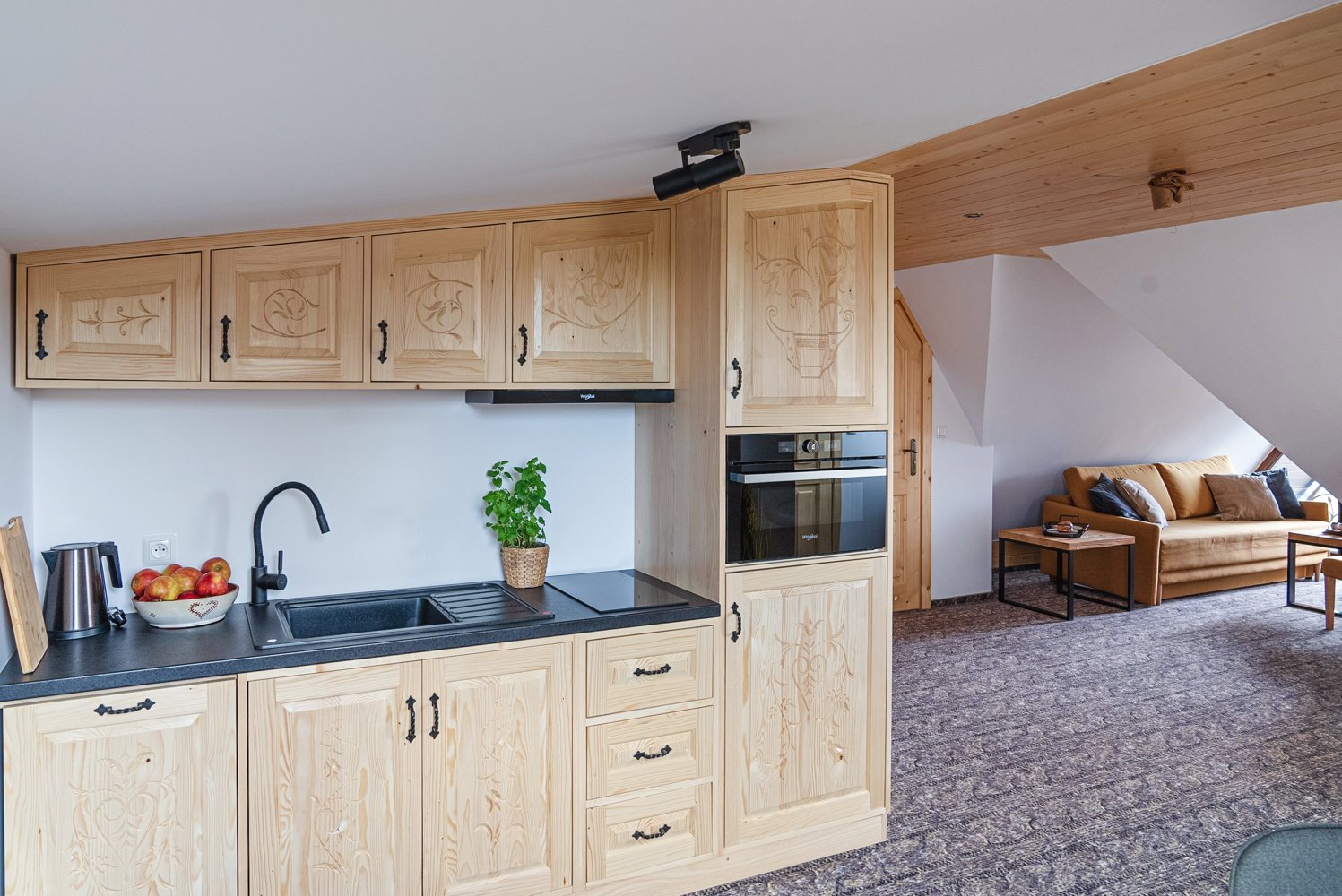 W apartamencie znajdują się 2 sypialnie, w każdej 2 łóżka pojedyncze oraz część wypoczynkowa z rozkładaną sofą 2-osobową. Apartament dysponuje dużym aneksem kuchennym (lodówka, zmywarka, mikrofalówka, zlew, płyta grzewcza, czajnik elektryczny, zastawa kuchenna i sztućce), drewnianymi meblami, telewizorem z płaskim ekranem oraz balkonem. W apartamencie znajduje się również łazienka z prysznicem, ręcznikami, suszarką do włosów, jest dostęp do Internetu oraz widok na panoramę Tatr.