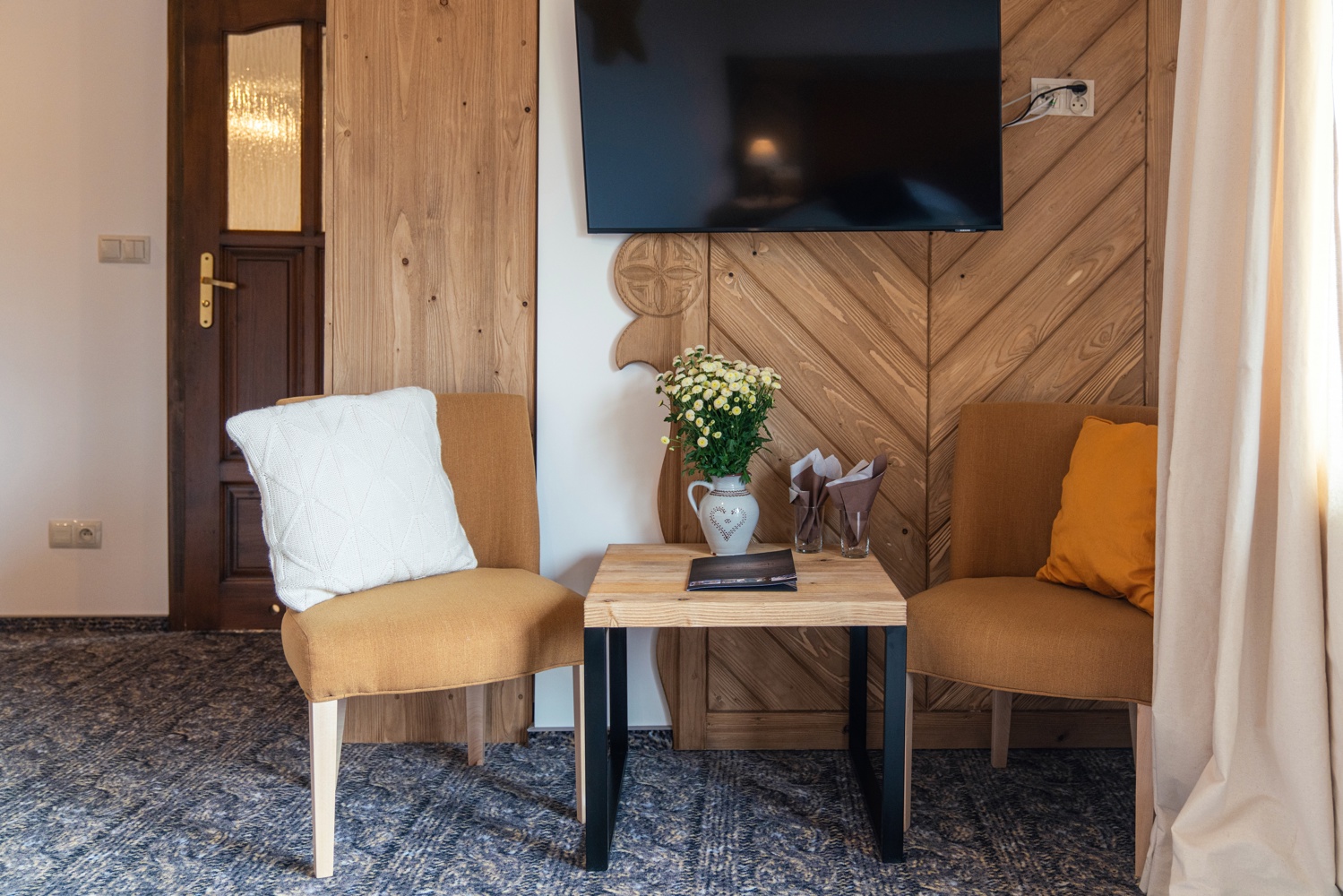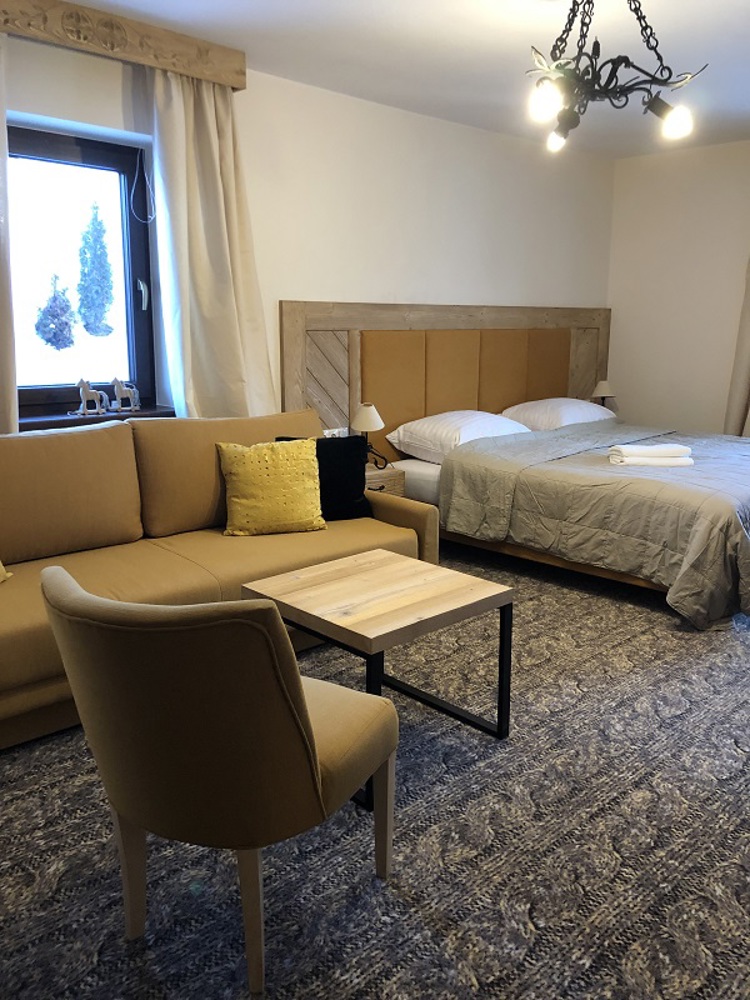 Klasycznie urządzony pokój czteroosobowy, dysponuje telewizorem i łazienką z prysznicem, ręcznikami i suszarką, posiada 2 łóżka pojedyncze lub łóżko małżeńskie i rozkładaną sofę.